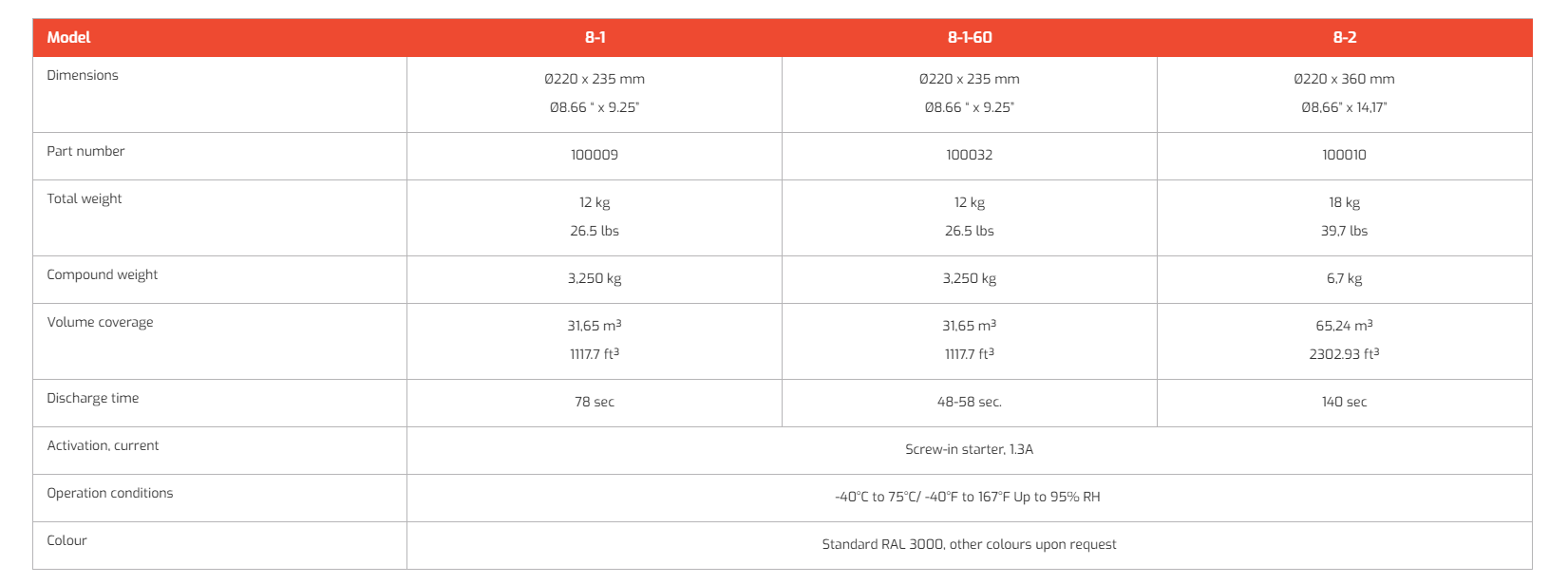 üzere tasarlanmıştır ve A, B, C ve F (K) sınıf yangınlarda etkilidir. DSPA 8-1-60 modeli 60 saniyeden kısa